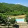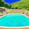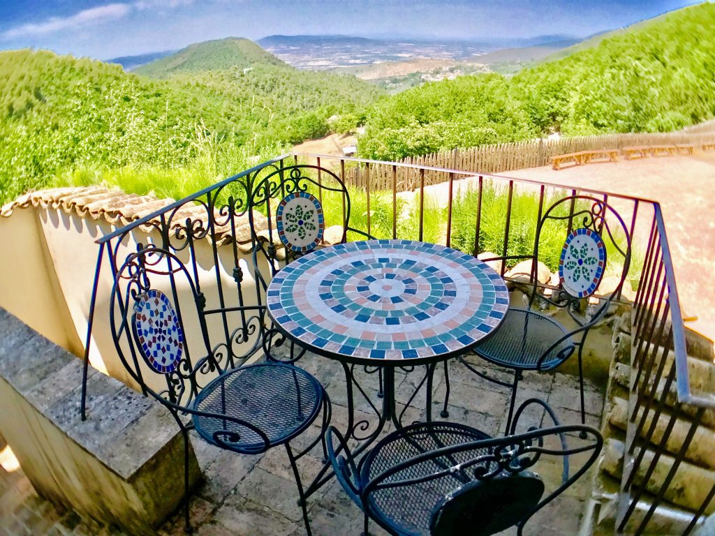 APT E/ground floor (50 sq mts) has 1 sitting/dining room (with fully fitted kitchen), 1 double bedroom (with double bed) + 1 shower room. This apartment has stunning panoramic views from all its windows in the sitting/dining room and pretty hill and wood views from the bedroom window. And, its main door opens onto a private patio area, seats 4, with pretty hill and wood views as well as stunning panoramic views of mountains, valleys, hill-top villages and the pool.