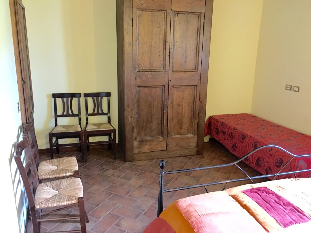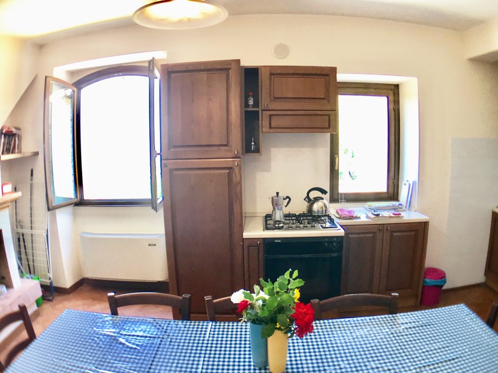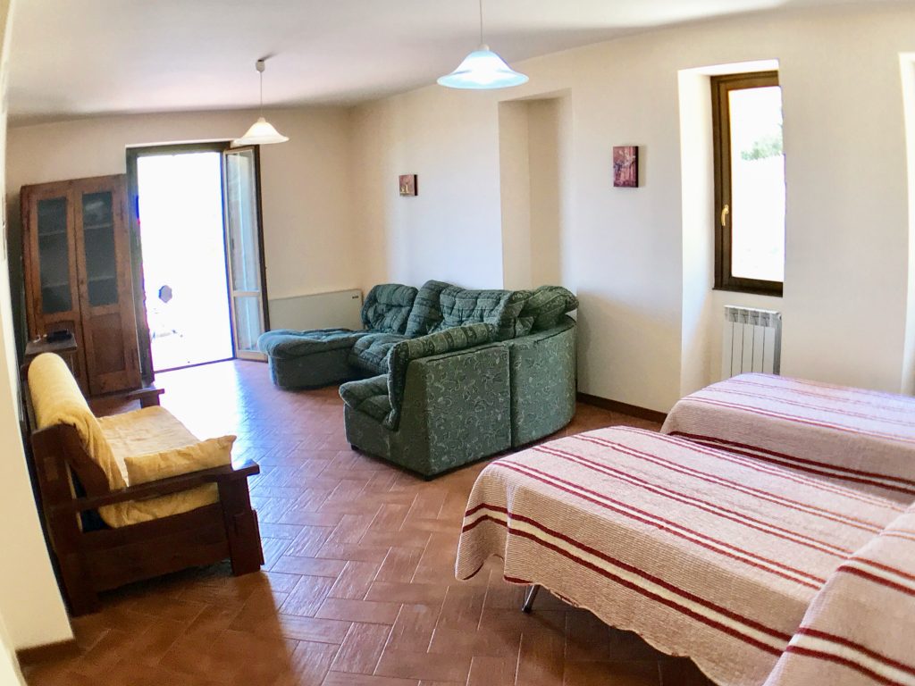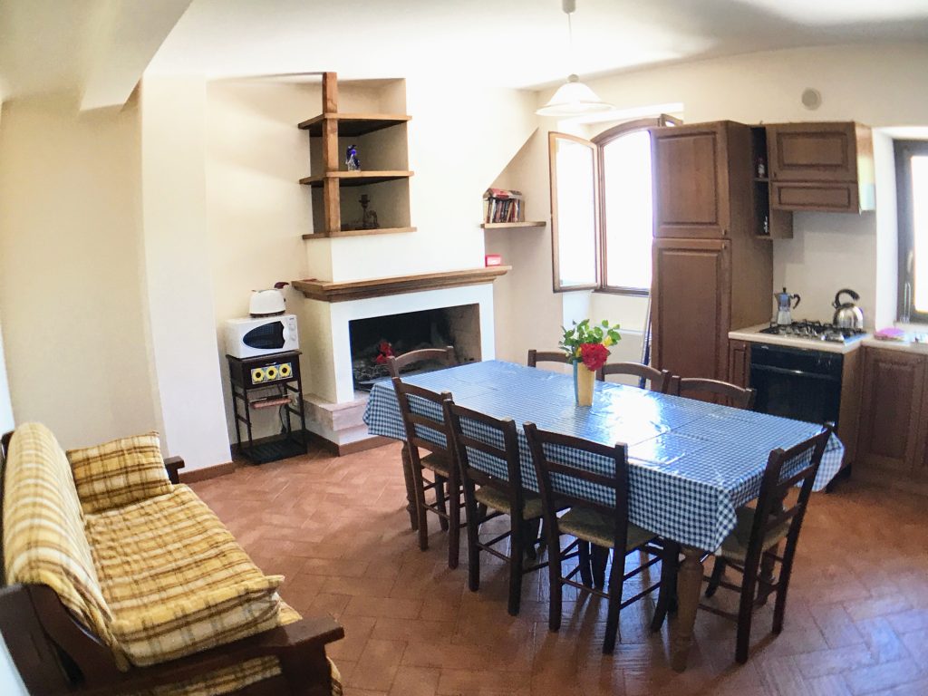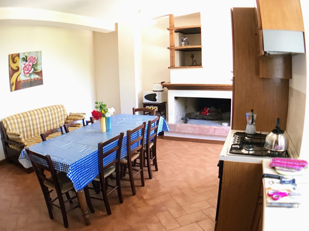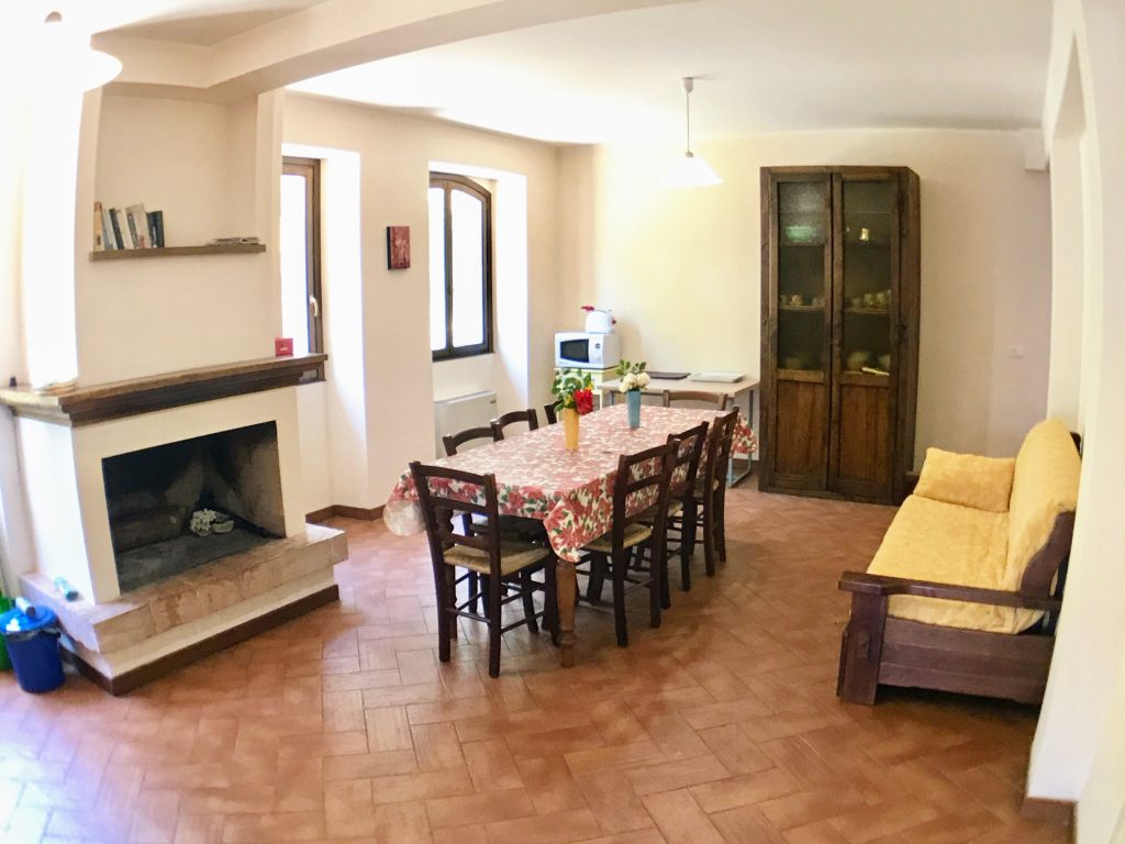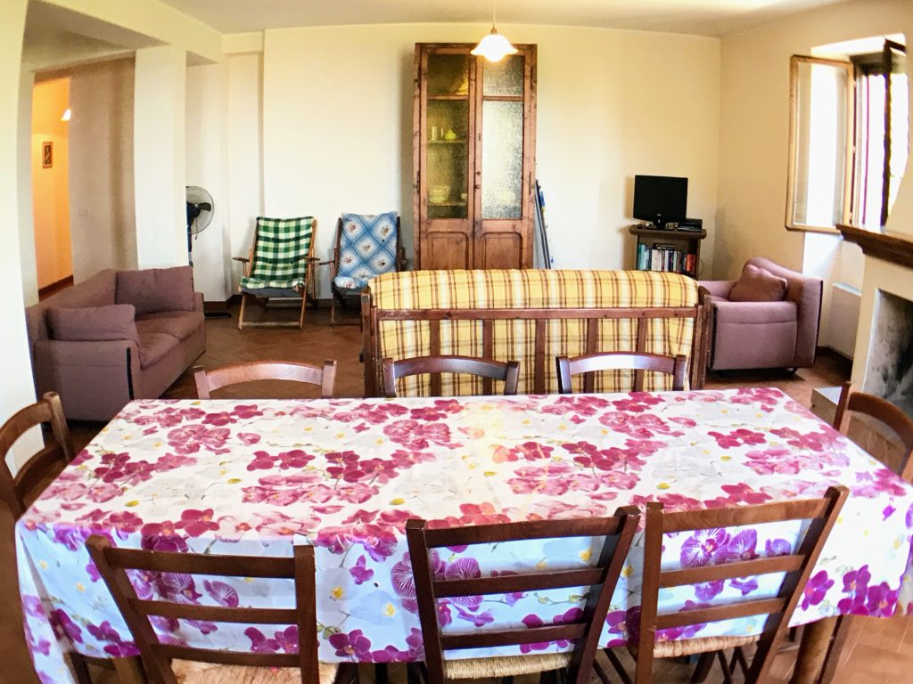 APT B/ground floor (100 sq mts) has 1 enormous sitting/dining room (with fully fitted kitchen), 2 triple bedrooms (each with double bed and single bed) + 2 shower rooms, 1 with full-sized tub. 2 extra single beds can be unobtrusively placed in an alcove in the sitting/dining room. Stunning panoramic views of mountains and valleys from all windows. Balcony, seats 4, with same stunning views towards Assisi.