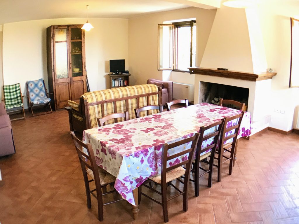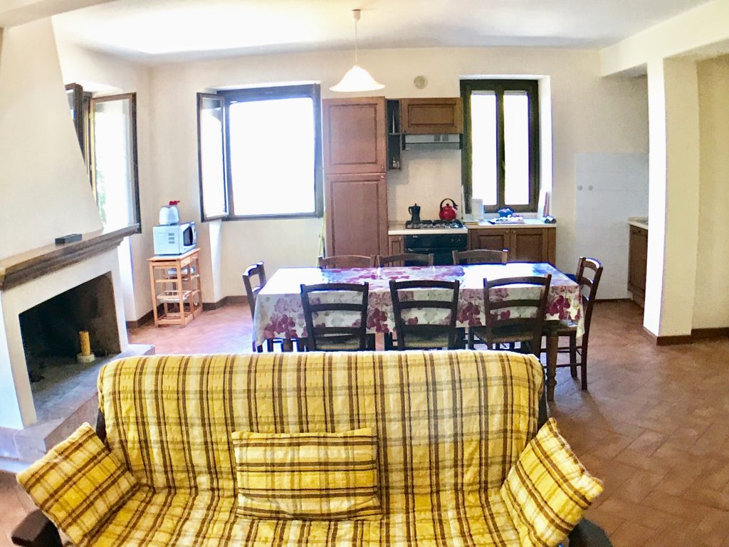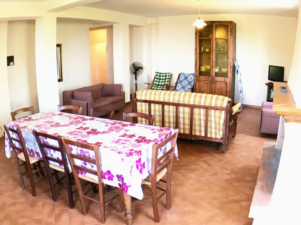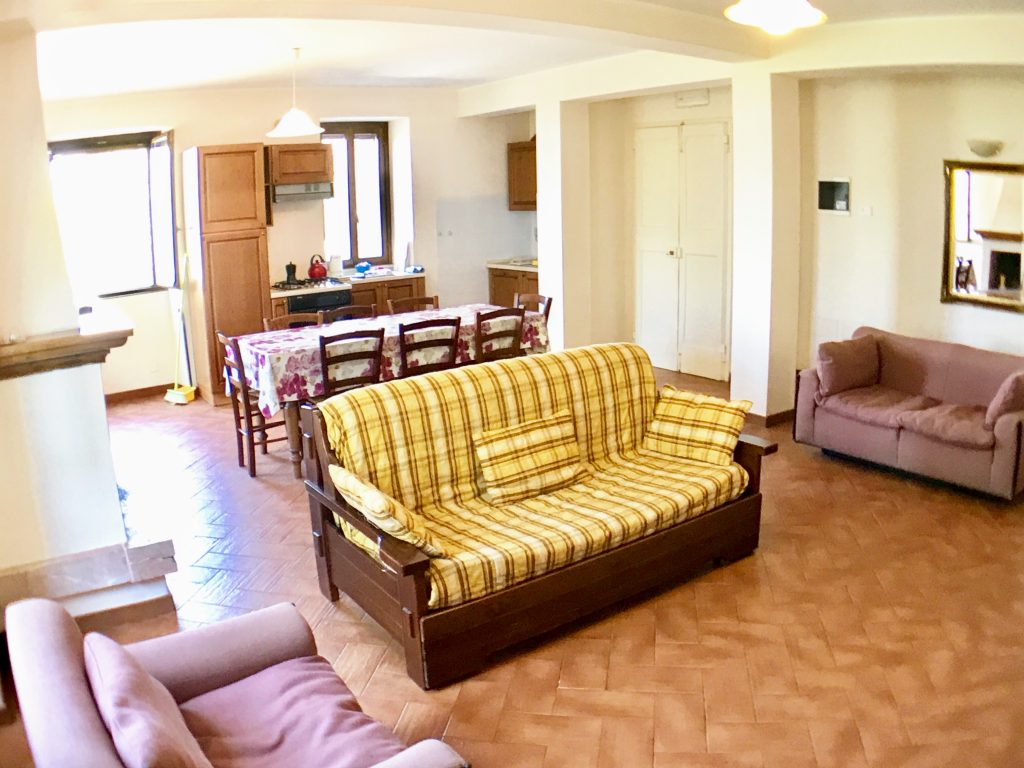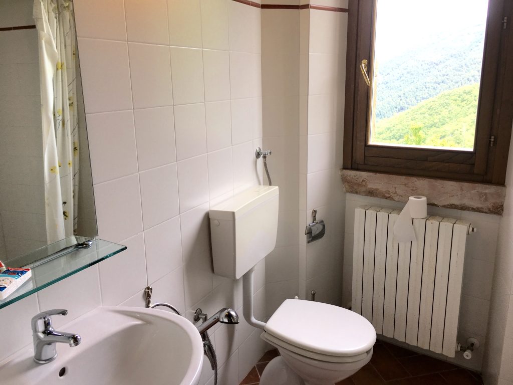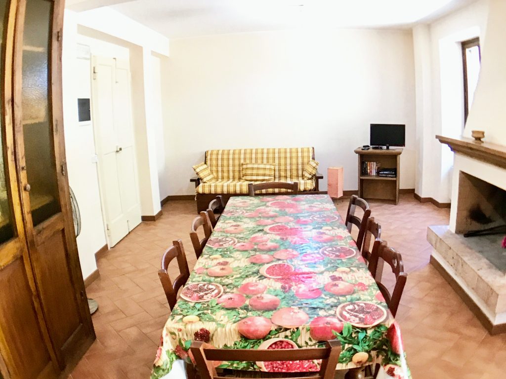 APT B/ground floor (100 sq mts) has 1 enormous sitting/dining room (with fully fitted kitchen), 2 triple bedrooms (each with double bed and single bed) + 2 shower rooms, 1 with full-sized tub. 2 extra single beds can be unobtrusively placed in an alcove in the sitting/dining room. Stunning panoramic views of mountains and valleys from all windows. Balcony, seats 4, with same stunning views towards Assisi.