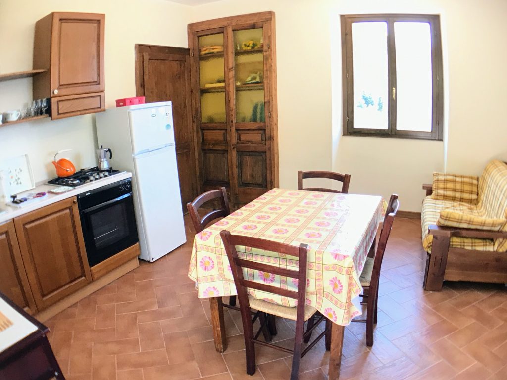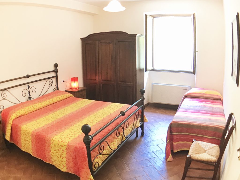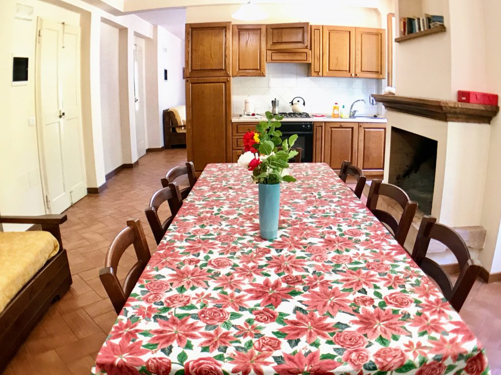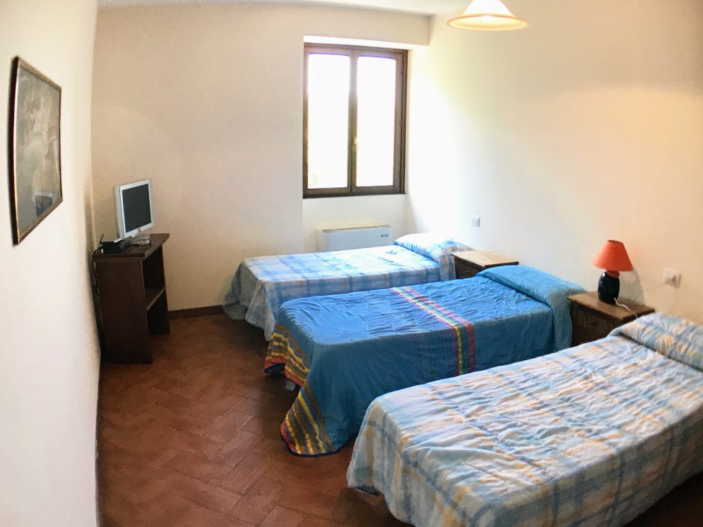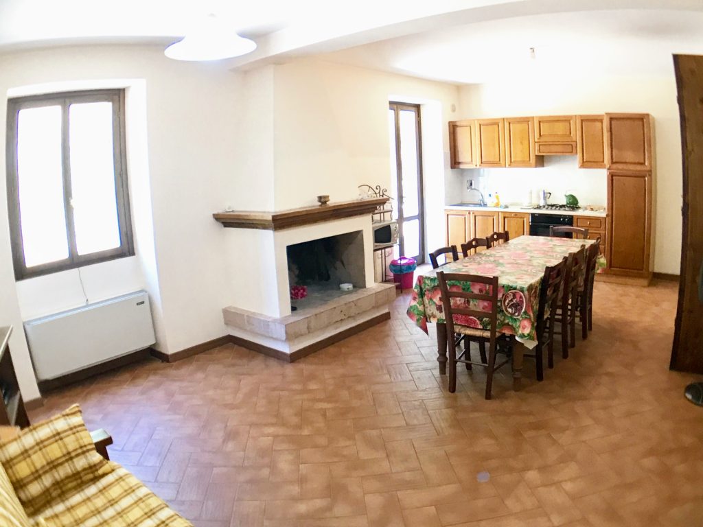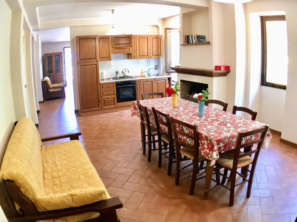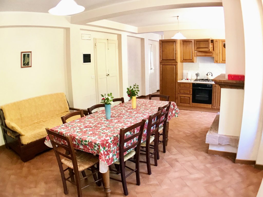 APT B/ground floor (100 sq mts) has 1 enormous sitting/dining room (with fully fitted kitchen), 2 triple bedrooms (each with double bed and single bed) + 2 shower rooms, 1 with full-sized tub. 2 extra single beds can be unobtrusively placed in an alcove in the sitting/dining room. Stunning panoramic views of mountains and valleys from all windows. Balcony, seats 4, with same stunning views towards Assisi.