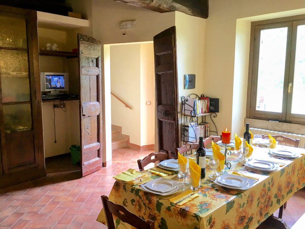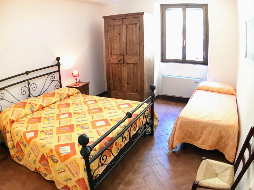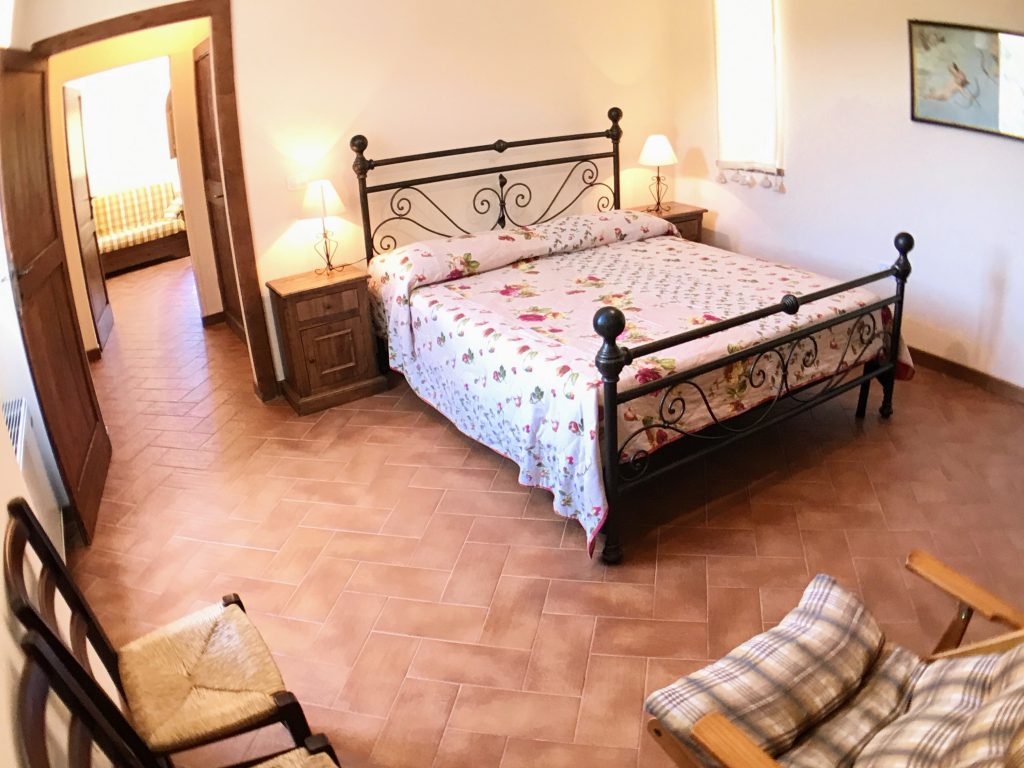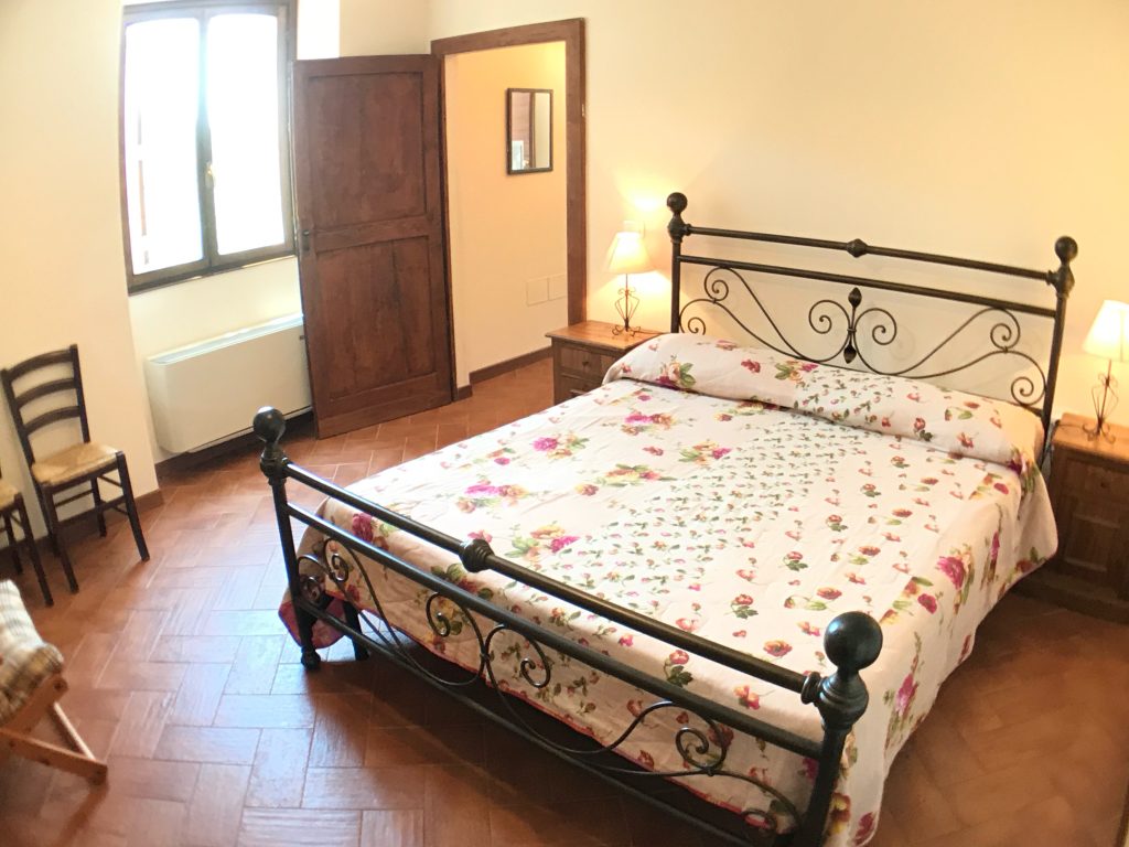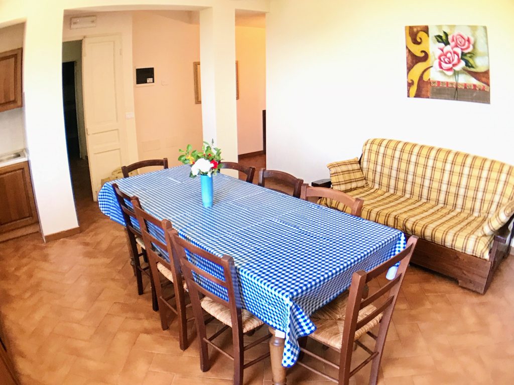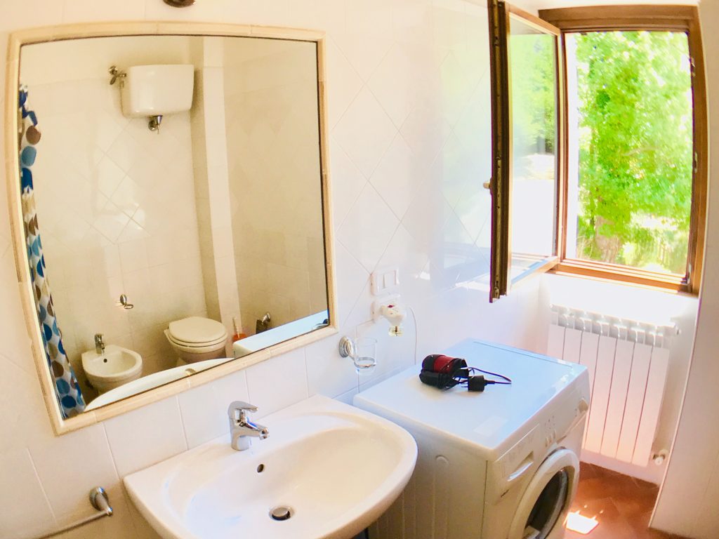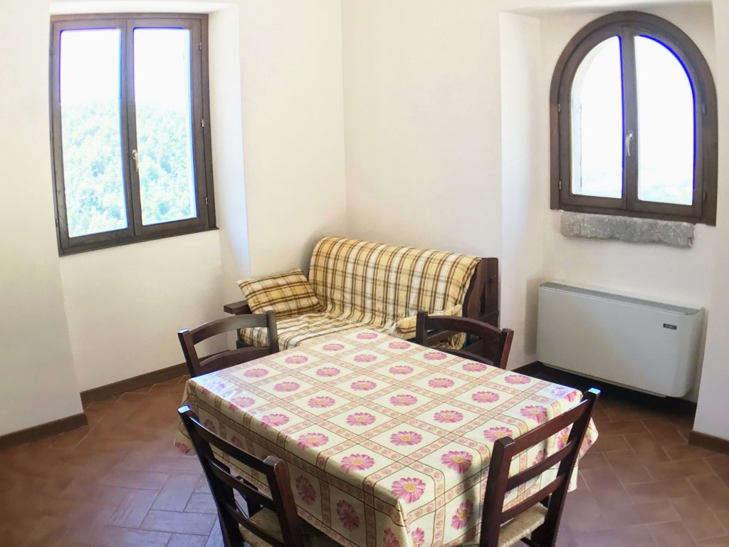 APT B/ground floor (100 sq mts) has 1 enormous sitting/dining room (with fully fitted kitchen), 2 triple bedrooms (each with double bed and single bed) + 2 shower rooms, 1 with full-sized tub. 2 extra single beds can be unobtrusively placed in an alcove in the sitting/dining room. Stunning panoramic views of mountains and valleys from all windows. Balcony, seats 4, with same stunning views towards Assisi.