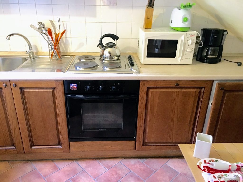 1 fully fitted kitchen + 3 kitchenettes : 2 kitchenettes attached to each of the 2 bedrooms on either side of the upper house, 1 kitchenette in a utility room on the ground floor, plus a fully fitted galley kitchen, directly off the dining room, which seats 12, on the ground floor.